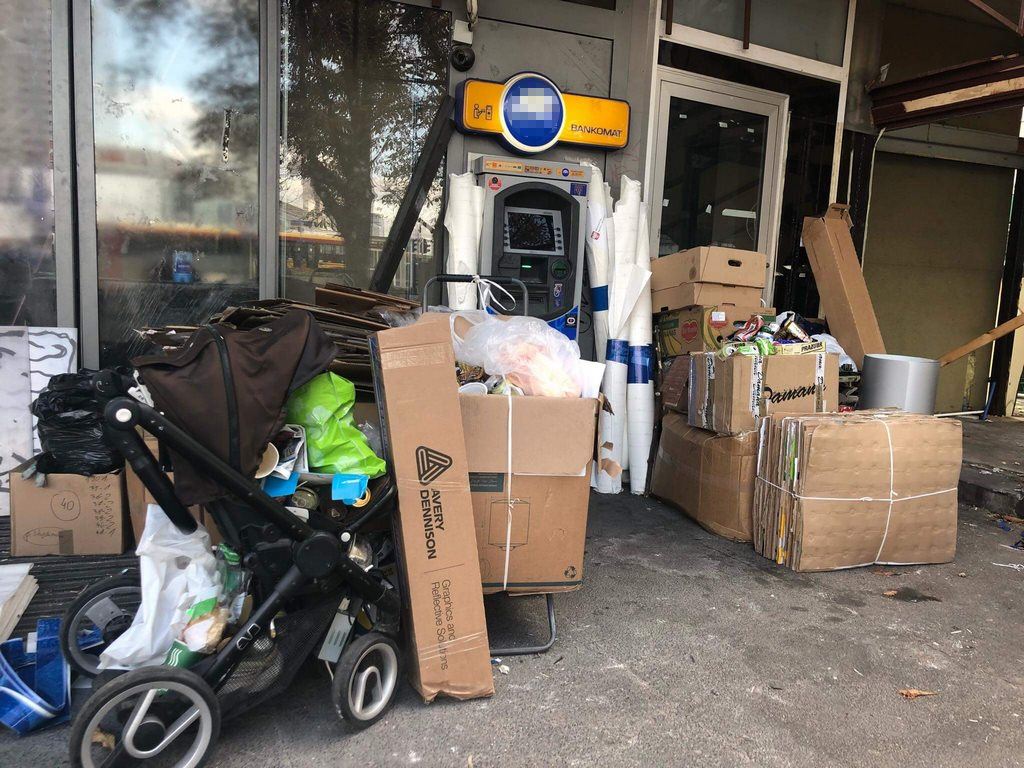 Udaliśmy się na miejsce i rzeczywiście widok jest dość specyficzny. Przed budynkiem wystawione są kartony i rzeczy poukładane tak, by zrobić wąskie dojście do bankomatu.