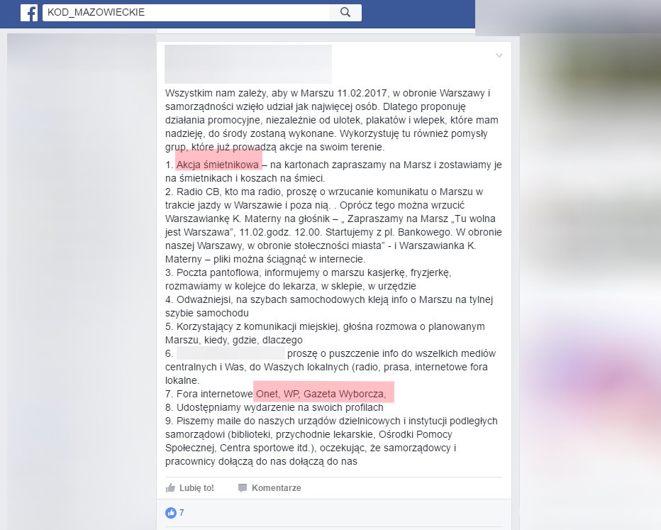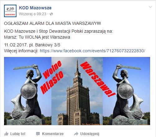 „Region Mazowsze Komitetu Obrony Demokracji zaprasza wszystkich, którym dobro Warszawy i okolicznych gmin nie jest obce – wyraźmy swój sprzeciw. Nie ma zgody na Pisu metody!