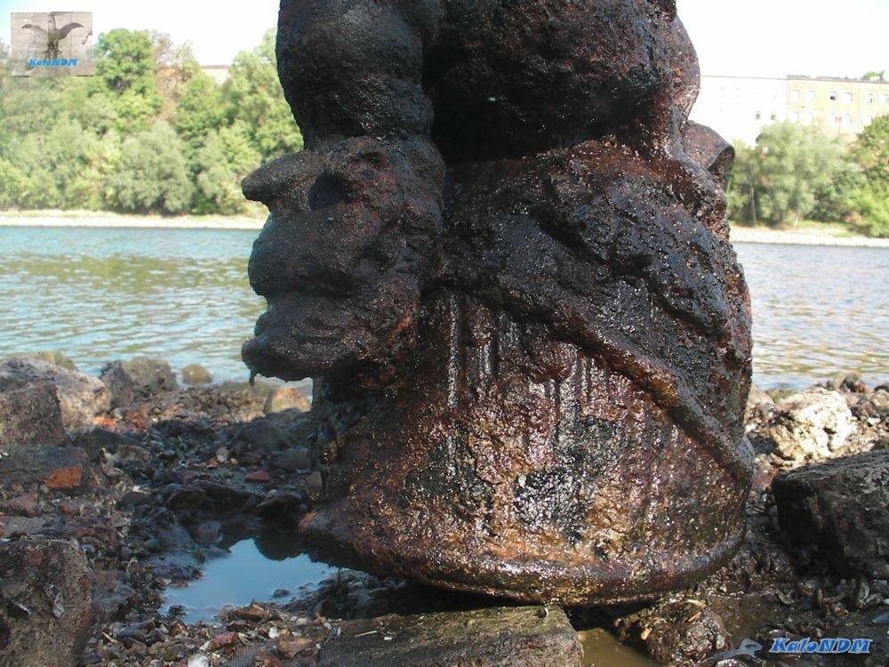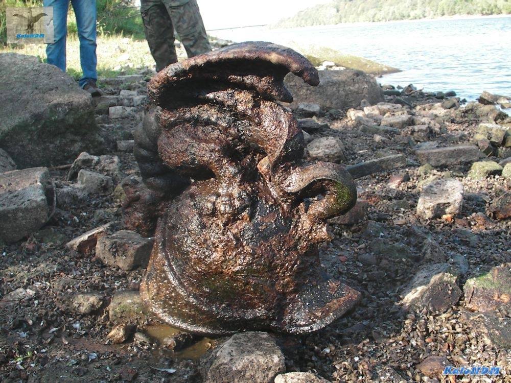 „30.08 wybrałem się z żoną kajakiem na eksplorację wystających elementów po naszym nowodworskim spichlerzem” – opowiada nam Sławomir Kaliński – „Poprosiłem ją, żeby dobrze wpatrywała się w dno ponieważ siedziała na początku i to ona to zobaczyła około 50-60 cm pod wodą. Wyszedłem, żeby sprawdzić… Stwierdziłem, że może być to antyczny hełm ze spichlerza… tylko 10% dawałem na to, że może być to dzwon. 31.08 poinformowałem o tym Miejskiego Konserwatora Zabytków Marka Przeździeckiego, podając swoje dane i nr telefonu. Powiedział, że leży to w gestii Mazowieckiego Konserwatora Zabytków i, że przekaże sprawę informując mnie kiedy będzie z Mazowieckim na miejscu, żebym wskazał im lokalizację. Jak się potem okazało (informacja od Sławka Robakiewicza, dziennikarza Mazowieckiego Gońca Lokalnego), Mazowiecki Konserwatro z Miejskim byli pod spichlerzem nie informując mnie w ogóle, że są na miejscu. Sławek Robakiewicz poprosił więc o oficjalne pismo urzędowe, co zlokalizowali pod spichlerzem. Okazało się, że zlokalizowali tylko elementy metalowe, tj. fragmenty barek i mostu – próbowałem się z tym przebić w mediach we wrześniu 2012 roku – o których wie każdy mieszkaniec Nowego Dworu Mazowieckiego… hełmu nie zlokalizowali. Wobec tego poprosiłem kilku miłośników historii o pomoc. Poprzez Grupę Na Straży Historii „Masovia”, która do współpracy zaangażowała Mazowieckie Stowarzyszenie Historyczne „Exploratorzy.PL” i KPE Eksplorer Łodź Polesie. O pomoc poprosiliśmy również będącą na miejscu jednostkę OSP z Nowego Dworu Maz., która w tym czasie była na ćwiczeniach. Oczywiście wszystko było mozliwe, dzięki właścicielowi Spichlerza, Darkowi Banaszkowi, który wpuścił nas na miejsce. Takim oto sposobem uratowaliśmy unikatowy maszkaron hełmu antycznego, który pierwotnie wisiał na spichlerzu. Jest to jedyny taki okaz ponieważ na hełmie jest smok. Na wszystkich czterech, które wiszą do tej pory na spichlerzu są pióropusze”