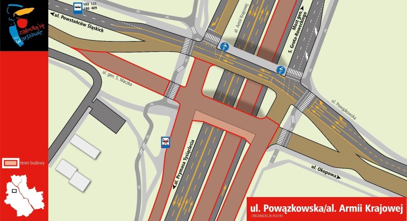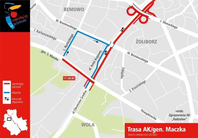 - od piątku 17 lipca ok. godz. 22.00 zamknięta będzie zachodnia (w kierunku ul. Okopowej) jezdnia ul. gen. S. Maczka od skrzyżowania z ul. L. Rudnickiego do wiaduktu nad trasą. W kierunku Bemowa ulicami Powązkowską i gen. S Maczka kierowcy będą mogli jechać dwoma pasami ruchu, natomiast w przeciwnym pojadą objazdem. W kierunku centrum oraz na Trasę AK w stronę Poznania pojadą ul. L. Rudnickiego do W. Broniewskiego i stąd albo do ul. ks. J. Popiełuszki i Ronda Zgrupowania AK „Radosław” (kierunek do centrum) albo do jezdni zbiorczej Trasy AK (kierunek Poznań). Tak będzie do poniedziałkowego ranka 20 lipca ok. godz. 6.00. Zostaną wprowadzone zmiany w komunikacji. Autobusy linii 103, 122, 180 i 409 – tylko w kierunku pętli Dw. Zachodni (Tunelowa), Gwiaździsta, Wilanów i Bródno-Podgrodzie – od skrzyżowania ul. J. Kochanowskiego z ul. L. Rudnickiego będą kursowały ul. L. Rudnickiego, W. Broniewskiego, al. Armii Krajowej i Powązkowską.