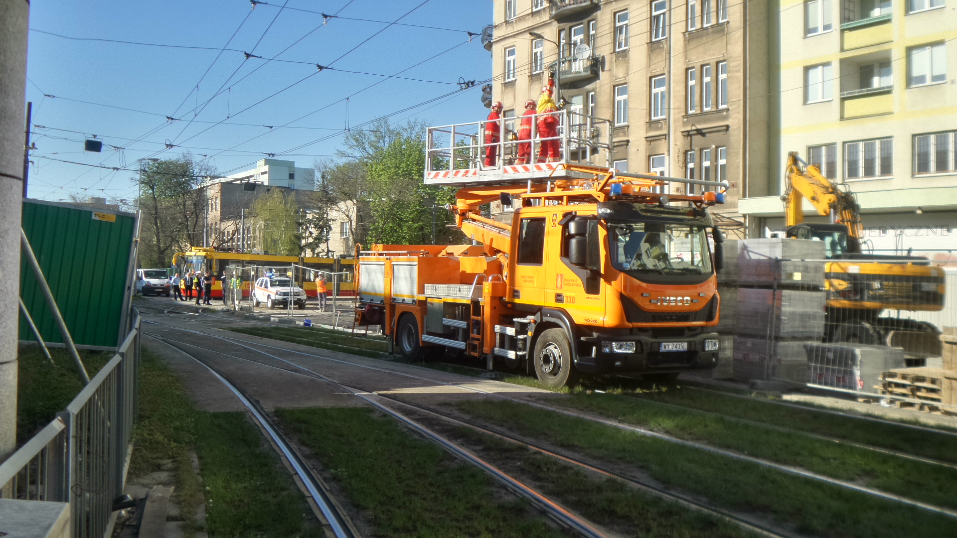 Koparka uszkodziła sieć trakcyjną dla tramwajów. Ruch wstrzymany na miejscu pracują służby.