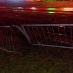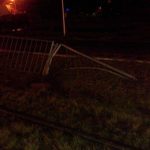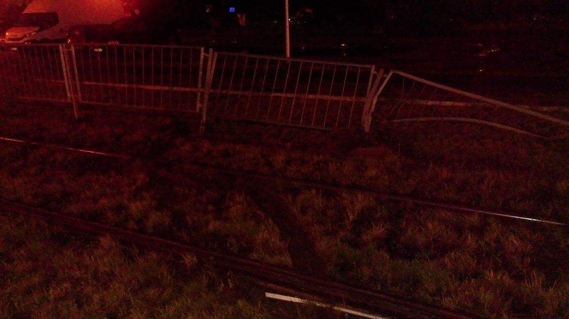 Auto skosiło znak, przejechało przez torowisko i uderzyło w bariery, ale nie powatrzymało to kierowcy, który pojechał dalej.