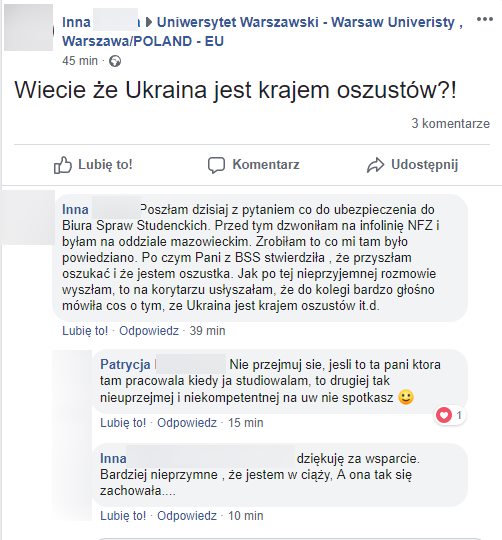 „Poszłam dzisiaj z pytaniem co do ubezpieczenia do Biura Spraw Studenckich. Przed tym dzwoniłam na infolinię NFZ i byłam na oddziale mazowieckim. Zrobiłam to co mi tam było powiedziano. Po czym Pani z BSS stwierdziła , że przyszłam oszukać i że jestem oszustka. Jak po tej nieprzyjemnej rozmowie wyszłam, to na korytarzu usłyszałam, że do kolegi bardzo głośno mówiła cos o tym, ze Ukraina jest krajem oszustów it.d.” – pisze Pani Inna na Facebooku.