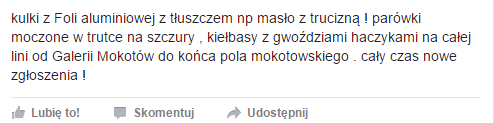 Uwaga na Mokotowie leżą kulki z folii aluminiowej z tłuszczem, parówki moczone w trutce na szczury, kiełbasy z gwoździami haczykami na całej linii od Galerii Mokotów do końca Pola Mokotowskiego.