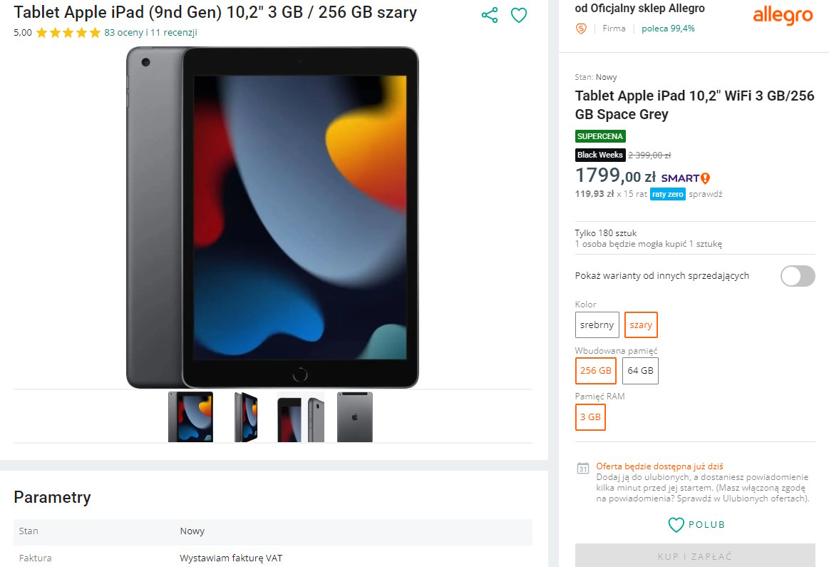 Już dziś, na platformie Allegro, rozpoczyna się wyjątkowa promocja, która z pewnością przyciągnie uwagę miłośników technologii Apple. iPad 9. generacji, z ekranem o przekątnej 10,2 cala i pamięcią wewnętrzną 256 GB, będzie dostępny w znacznie obniżonej cenie – tylko 1799 zł, zamiast standardowych 2399 zł.