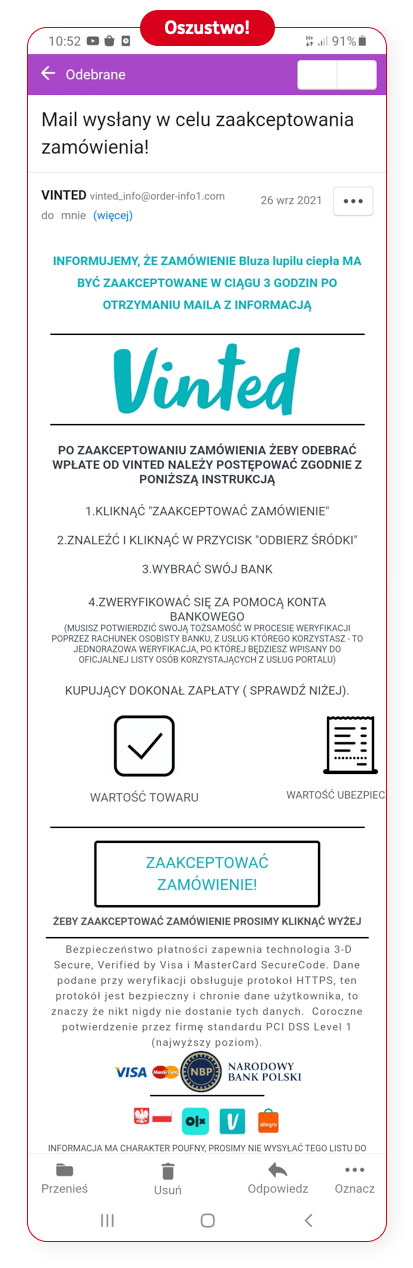 Scenariusz 2 – Nie udostępniaj swoich danych bankowych lub danych karty Oszuści wysyłają wiadomość na Vinted lub na OLX, np. „Właśnie kupiłam od Ciebie przedmiot. Potwierdź sprzedaż przez e-mail”. Fałszywy e-mail może wyglądać jak oficjalna korespondencja.