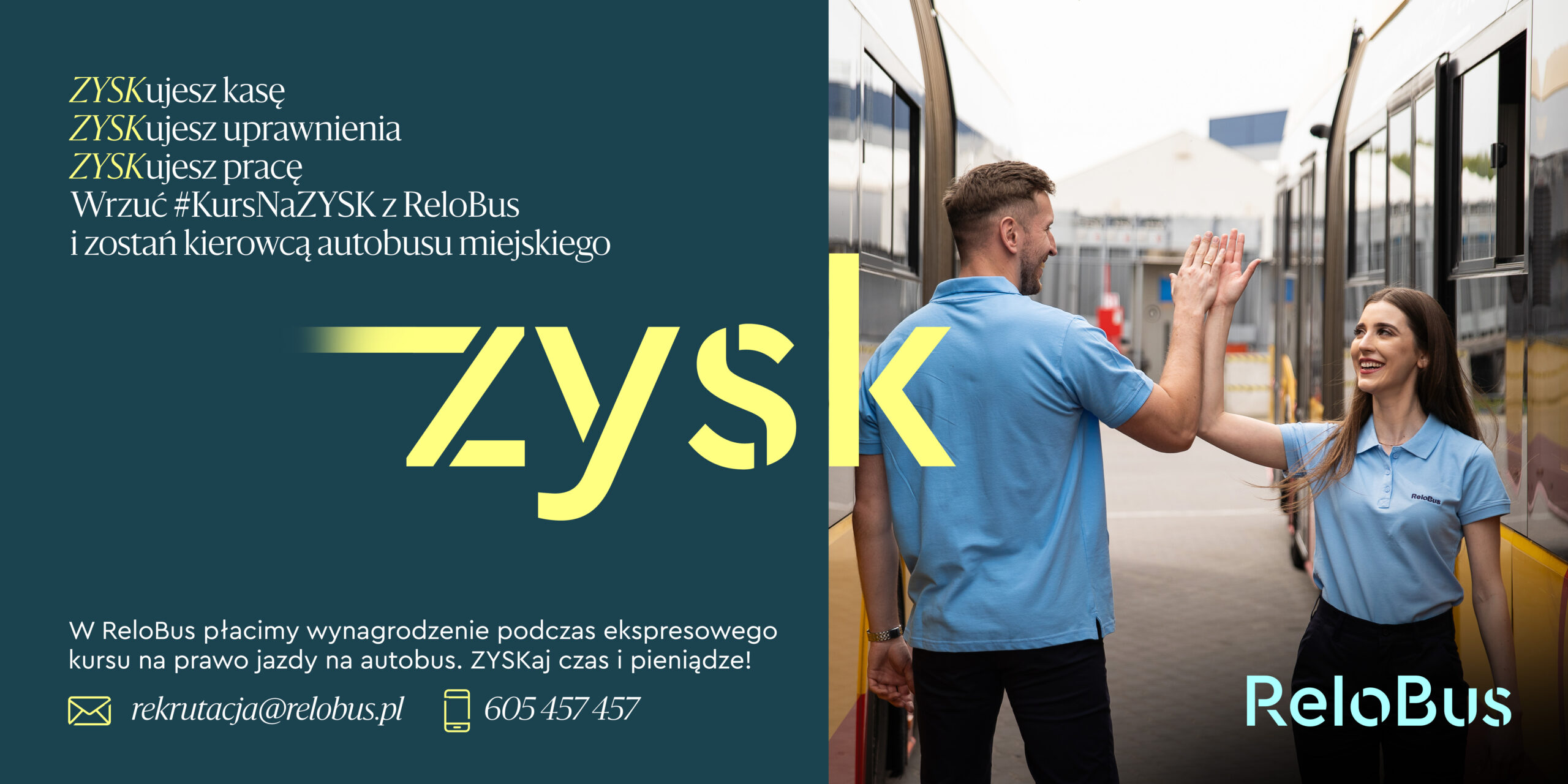 Oferta skierowana jest dla osób, które dołączą do zespołu w Warszawie. Ale ReloBus to firma z wieloletnim doświadczeniem, operująca także w Tczewie, Toruniu a od stycznia 2026 również w Gdańsku. W Akademii Kierowcy ReloBus znajdzie się rozwiązanie dla każdego, kto chce dołączyć. Jedziesz z nami? Skontaktuj się pod nr tel. 605 457 457 lub przez e-mail: rekrutacja@relobus.pl i wrzuć #KursNaZYSK.