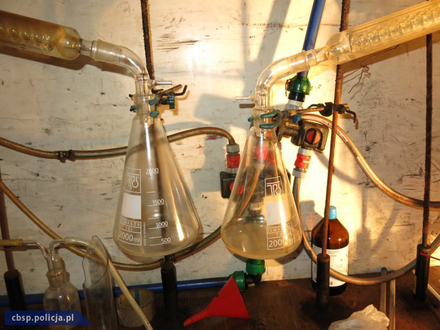 Na posesji policjanci zabezpieczyli ponad tonę odczynników chemicznych, służących do produkcji amfetaminy. W jednym z pomieszczeń gospodarczych znaleźli natomiast 18 kg świeżo wyprodukowanego narkotyku, który suszył się przy pracujących termowentylatorach. Oprócz tego w naczepie ciężarówki było 1,6 litra w postaci płynnej. Sumując, daje to ponad 20 kilogramów czystej amfetaminy, z której można wyprodukować około 100 kilogramów narkotyku do dalszej dystrybucji. Wartość narkotyku gdyby trafił do sprzedaży to milion złotych.