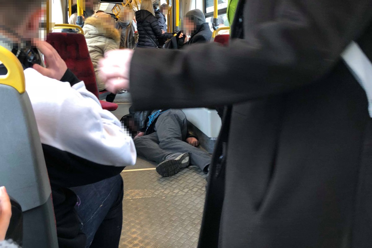 Leżał w przejściu w tramwaju. Reakcje pasażerów były skrajne