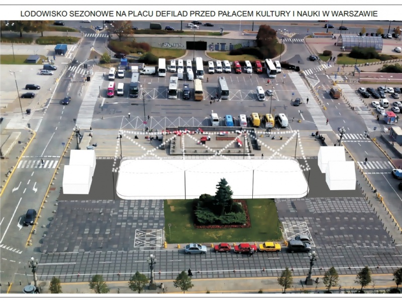 Właśnie został ogłoszony przetarg na wykonanie sezonowego lodowiska przed Pałacem Kultury i Nauki. Nowa miejska ślizgawka zostanie wybudowana w pobliżu trybuny honorowej na pl. Defilad, od strony ulicy Marszałkowskiej. Planowane otwarcie lodowiska już 6 grudnia.
