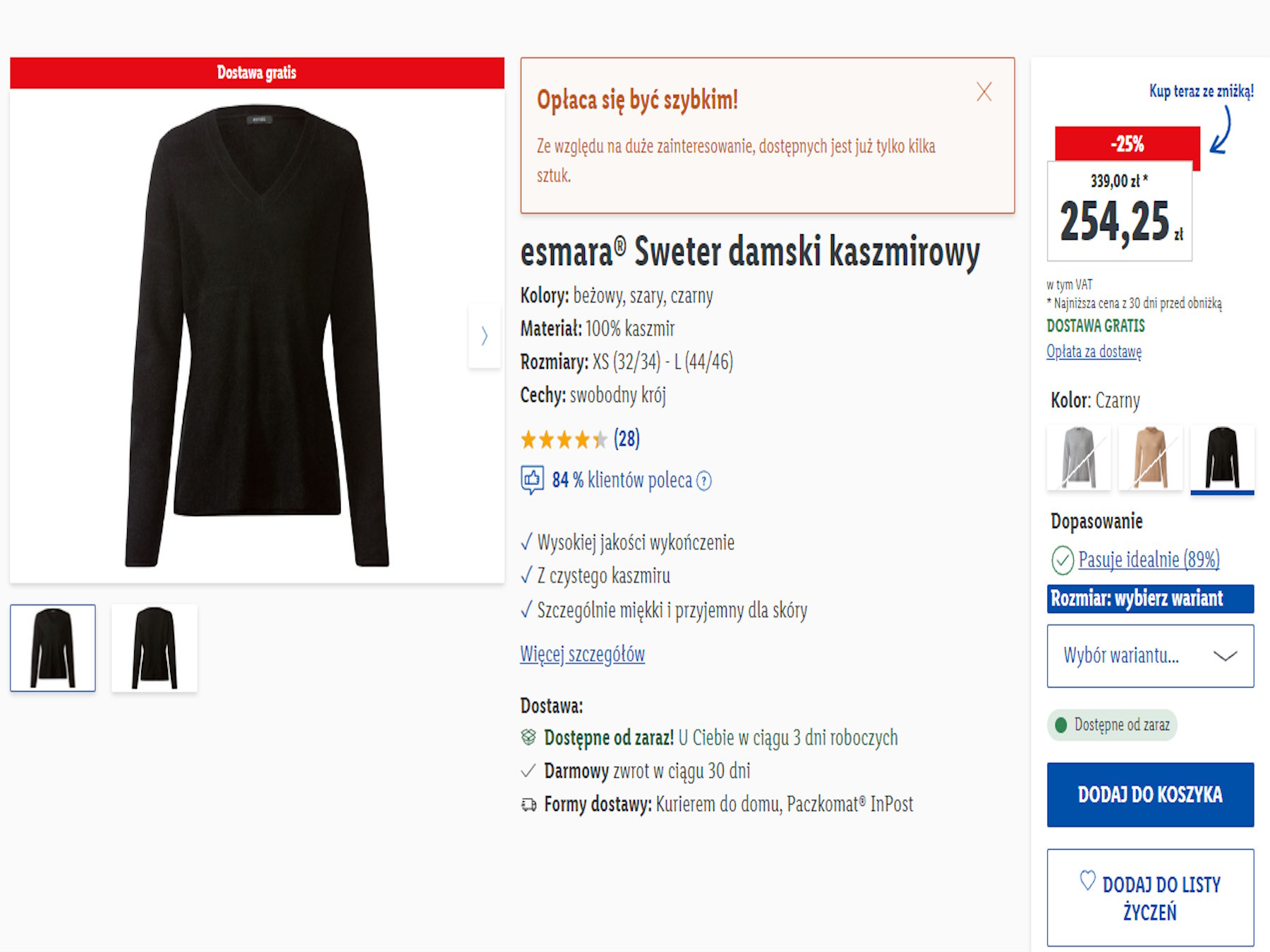 Promocja jest tym bardziej kusząca, że kaszmirowe swetry nie należą do najtańszych – standardowa cena takiego produktu to często kilkaset złotych. W Lidlu jednak możemy nabyć go za znacznie mniej, co jest świetną okazją do uzupełnienia swojej szafy o wysokiej jakości produkt. Sweter posiada również dobre recenzje od klientów, którzy już zdążyli go przetestować, co świadczy o jego jakości.