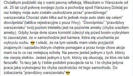 „Chciałbym podzielić się z wami pewną refleksją. Mieszkam w Warszawie od ok. 25 lat czyli połowę swojego życia a pochodzę spod Warszawy.Dzisiaj po raz kolejny moje auto zostało uszkodzone przez” prawdziwego” warszawiaka.Chociaż stało kilka aut to jednak moje auto stało się celem” dowcipnisia”(tablice rejestracyjne z poza Wwy). „Dowcipnisiu”,”prawdziwy warszawiaku” twój poziom intelektu jest na poziomie ameby (chyba uraziłam ameby).