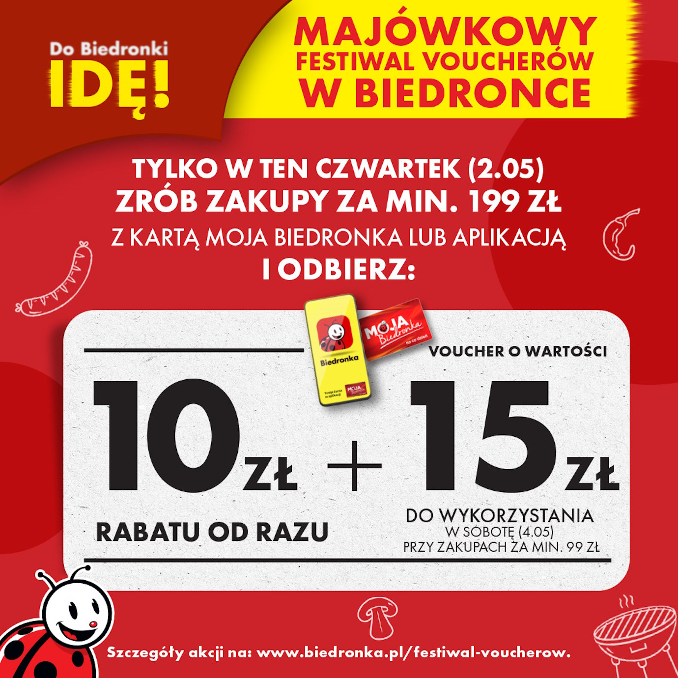 Każdy, kto dokona zakupów za minimum 199 zł z użyciem karty „Moja Biedronka” lub aplikacji, otrzyma natychmiastowy rabat w wysokości 10 zł. Ale to nie wszystko! Dodatkowo, na tę samą kartę zostanie załadowany voucher o wartości 15 zł, który będzie mógł być wykorzystany już w sobotę, 4 maja, przy kolejnych zakupach za minimum 99 zł.