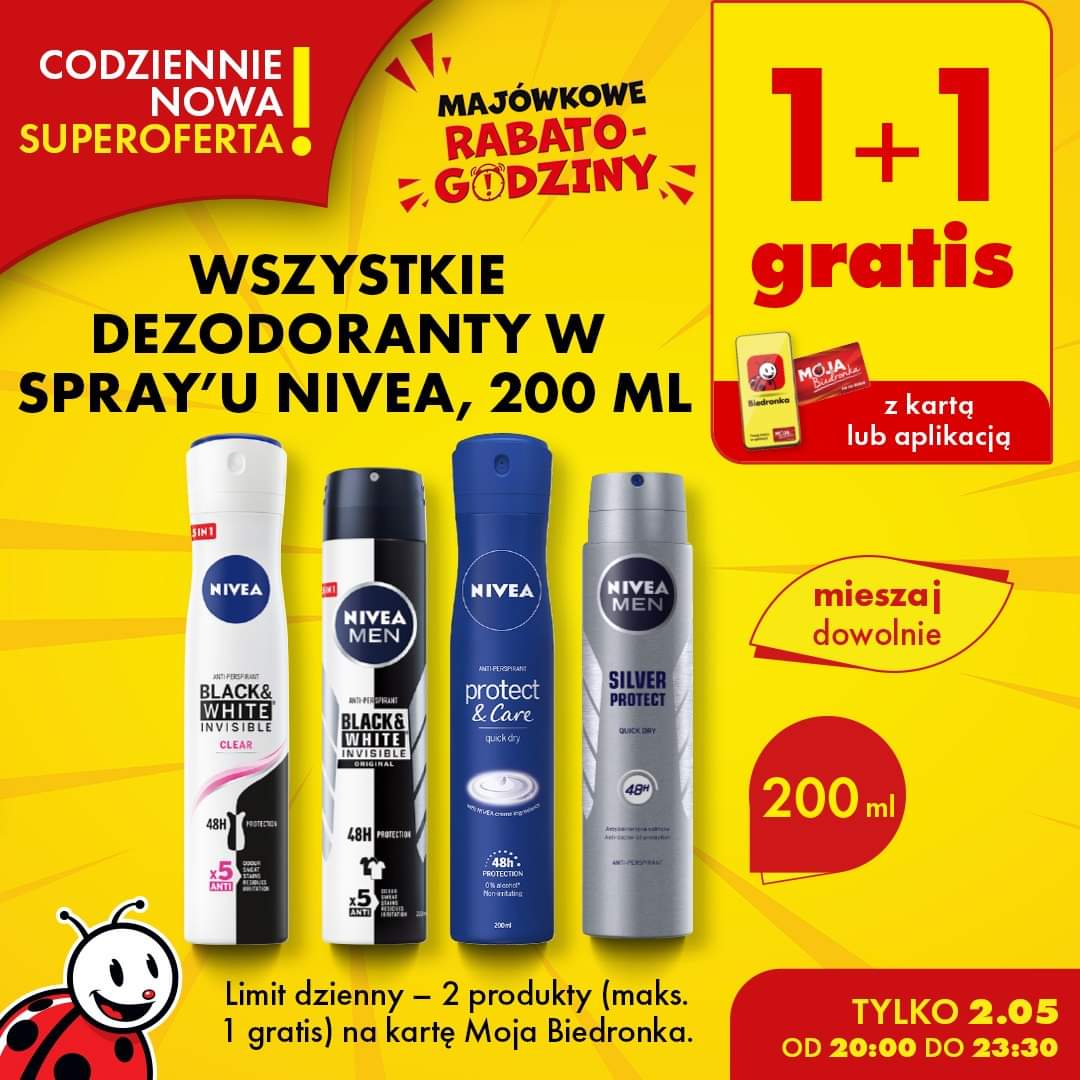 W ramach „Majówkowych Rabato-Godzin” Biedronka zaprasza do skorzystania z oferty 1+1 gratis na wszystkie dezodoranty NIVEA w sprayu o pojemności 200 ml. W promocji znajdziecie zarówno produkty dla kobiet, jak i mężczyzn, w tym bestsellery takie jak „NIVEA Black & White Invisible” oraz „Silver Protect”.