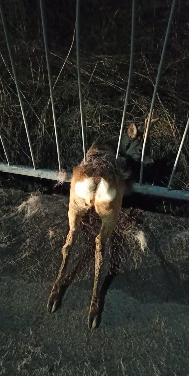 Komendant czosnowskiego komisariatu wspólnie z dzielnicowym, pełniąc nocną służbę zauważyli zakleszczonego w ogrodzeniu młodego jelonka. Policjanci natychmiast ruszyli z pomocą. Młode zwierzę nieszczęśliwie utknęło między przęsłami ogrodzenia.