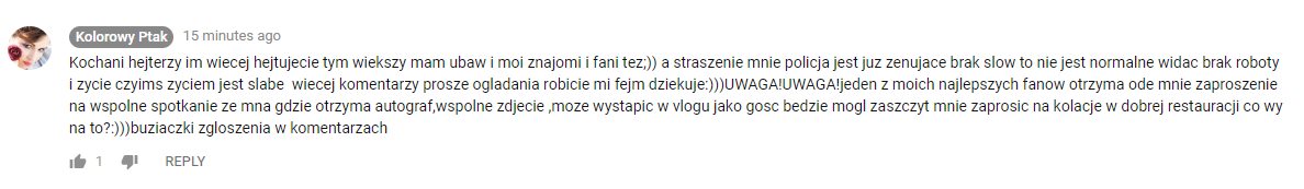 „Kochani hejterzy im wiecej hejtujecie tym wiekszy mam ubaw i moi znajomi i fani tez;)) a straszenie mnie policja jest juz zenujace brak slow to nie jest normalne widac brak roboty i zycie czyims zyciem jest slabe wiecej komentarzy prosze ogladania robicie mi fejm dziekuje:)))UWAGA!UWAGA!jeden z moich najlepszych fanow otrzyma ode mnie zaproszenie na wspolne spotkanie ze mna gdzie otrzyma autograf,wspolne zdjecie ,moze wystapic w vlogu jako gosc bedzie mogl zaszczyt mnie zaprosic na kolacje w dobrej restauracji co wy na to?:)))buziaczki zgloszenia w komentarzach” – skomentowała Piaskowy (pisownia oryginalna).