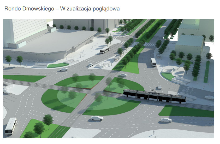Także i Rondo Dmowskiego przejdzie zmiany. Tutaj również pojawią się drzewa i trawa.