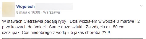 Na problem zwrócił uwagę Pan Wojciech na lokalnej grupie: „W stawach Cietrzewia padają ryby . Dziś widziałem w wodzie 3 martwe i 2 przy koszach do śmieci . Same duże sztuki . Za zdjęciu ok. 50 cm szczupak .Coś niedobrego z wodą lub jakaś choroba ?? !!”