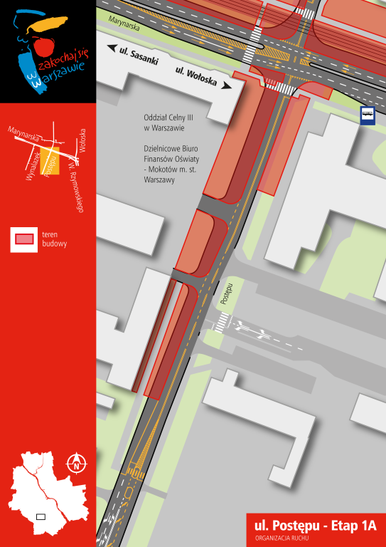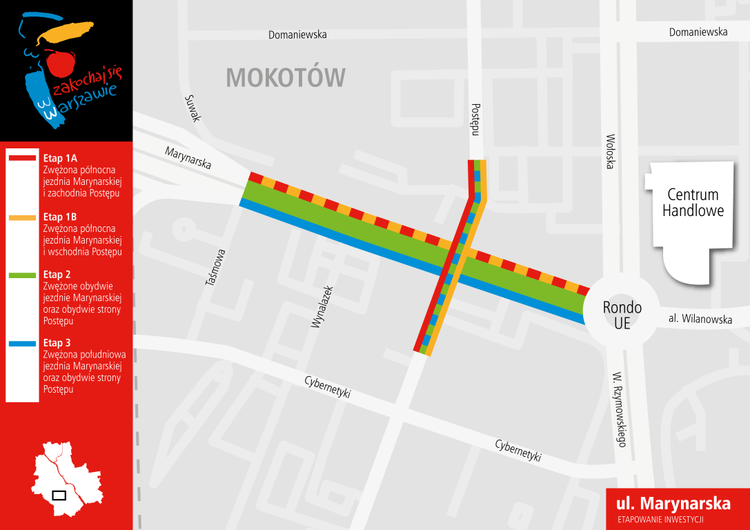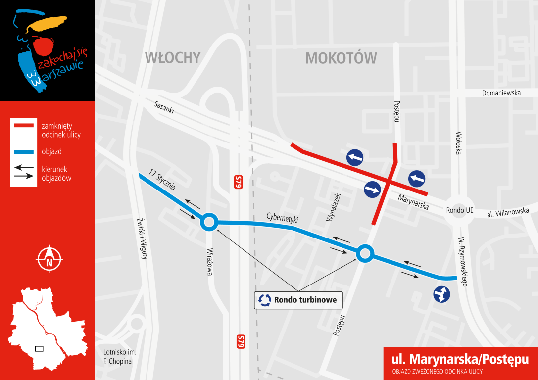 W piątek, 30 września, ok. godz. 22.00 na ul. Marynarskiej i Postępu zostaną wprowadzone zmiany w organizacji ruchu. Do dwóch pasów zwężona zostanie północna jezdnia ul. Marynarskiej, ruch na południowej będzie odbywał się bez zmian. Węziej będzie też na ul. Postępu pomiędzy ul. Cybernetyki a Domaniewską – kierowcy będą mieli tu do dyspozycji po jednym pasie ruchu w każdym kierunku. Niemożliwe będą skręty w lewo z ul. Marynarskiej w Postępu, z Postępu w Marynarską oraz z Marynarskiej w Wynalazek i z Wynalazku w Marynarską. Z ul. Marynarskiej nie będzie można skręcać w ul. Postępu także w prawo.