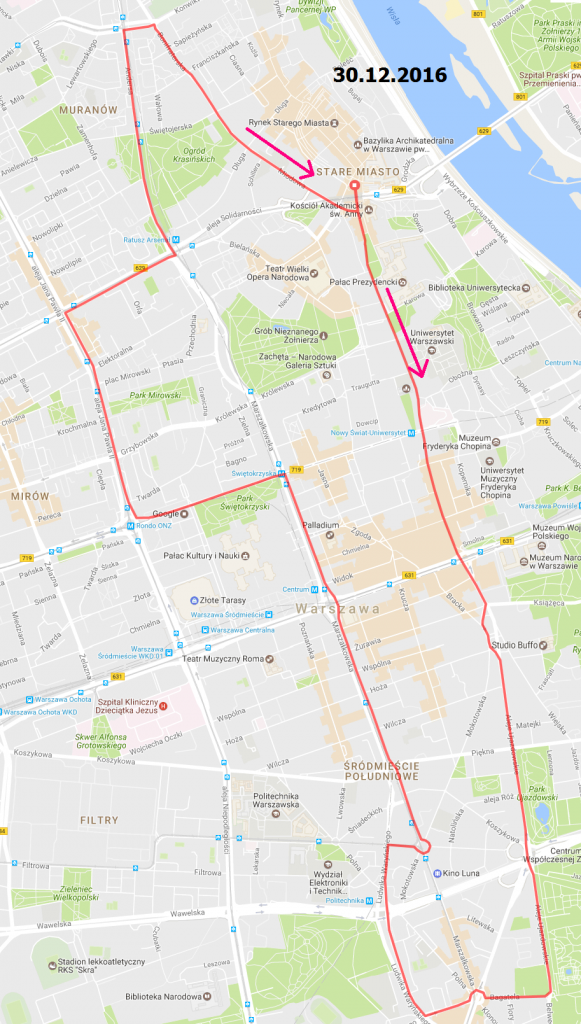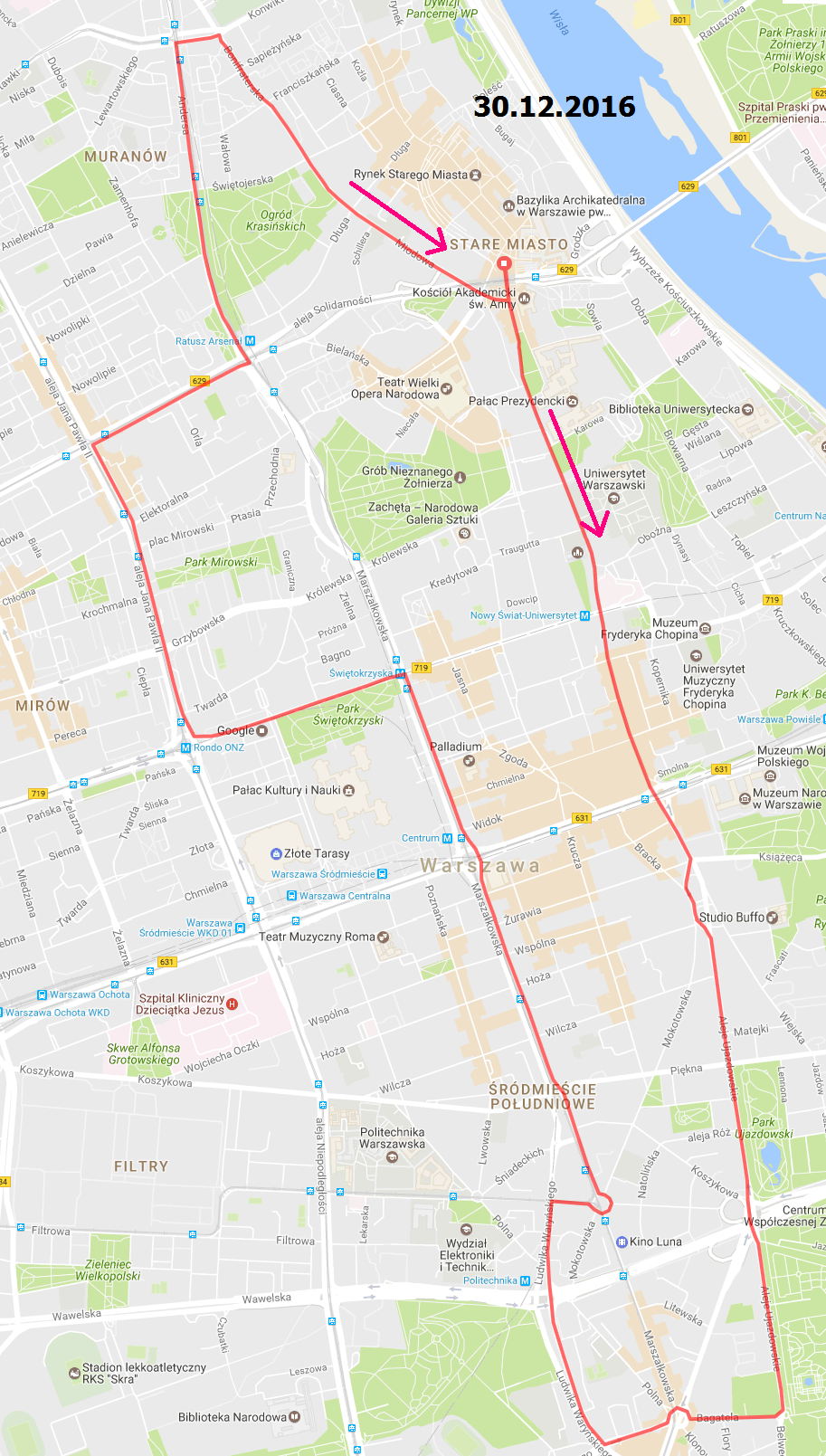 Start o 18.00, zakończenie planowane na 22.00. Trasa przejazdu: Pl. Zamkowy, Krakowskie Przedmieście, Nowy Świat, Pl. Trzech Krzyży, al. Ujazdowskie,Pl. Na Rozdrożu, Al. Ujazdowskie Bagatela, Pl. Unii Lubelskiej, Boya- Żeleńskiego, Waryńskiego, Rondo Jazdy Polskiej, Waryńskiego, Nowowiejska, Pl. Zbawiciela, Marszałkowska, Pl. Konstytucji, Marszałkowska, Rondo Dmowskiego, Marszałkowska, Świętokrzyska, Rondo ONZ, AL. Jana Pawła II, Al. Solidarności, PL. Bankowy, Andersa, Muranowska, Bonifraterska, Pl. Krasińskich, Miodowa, Pl. Zamkowy.