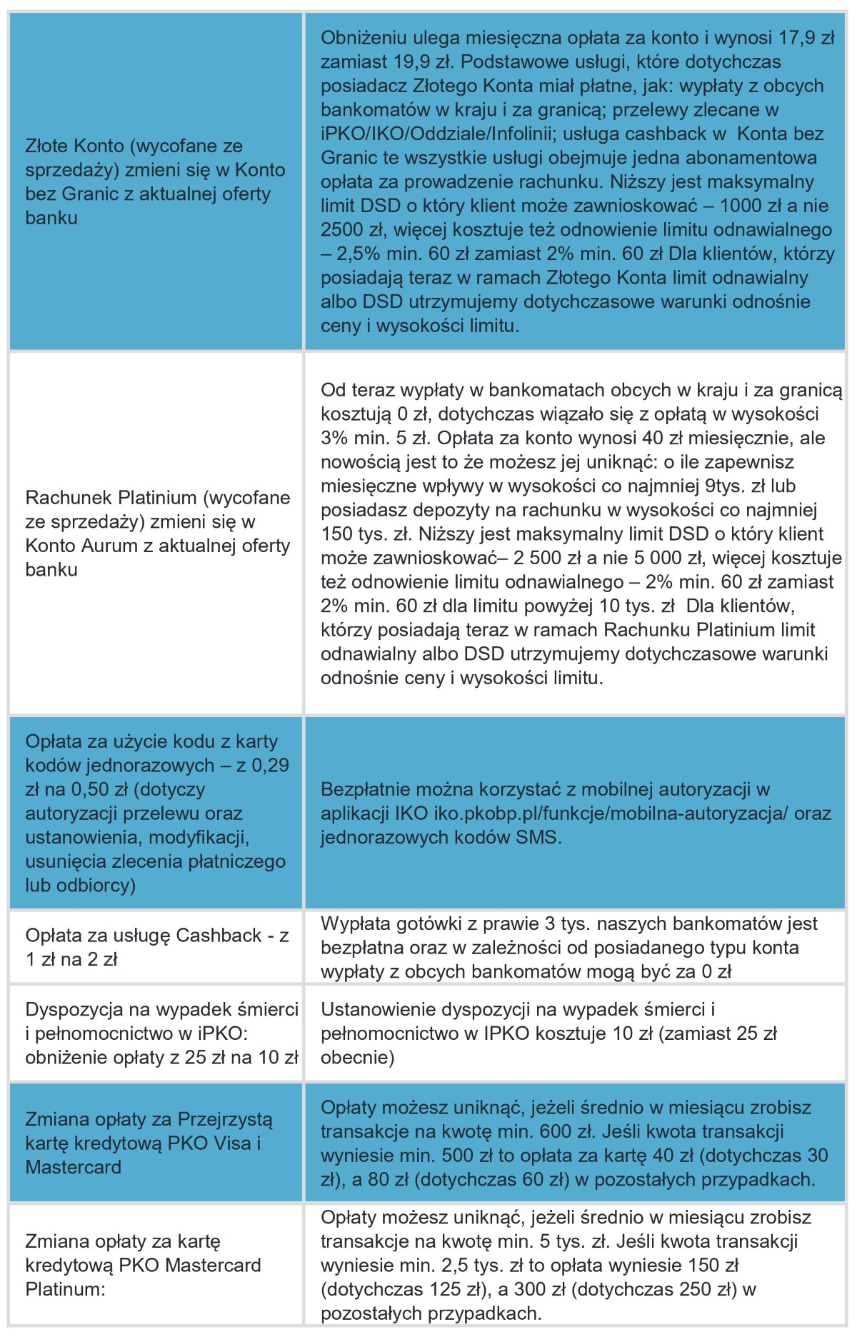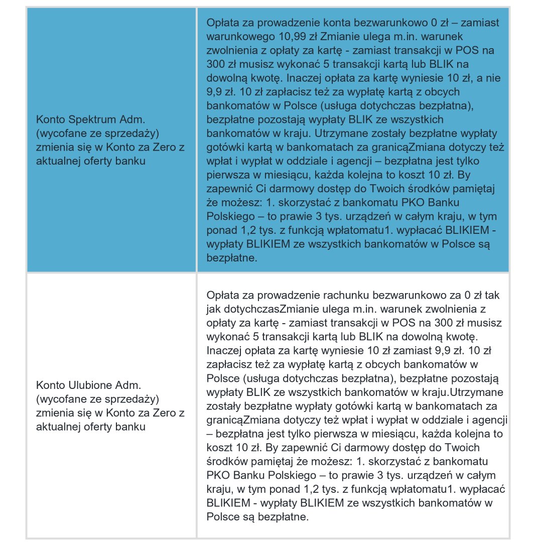 Na pierwszy rzut oka widać, że zmieniła się struktura dostępnych kont. Niektóre z nich nie są już oferowane i zostały zastąpione przez PKO Konto za Zero. Jak można się domyśleć po nazwie, konto nie wiąże się z opłatami, jednak karta do konta jest darmowa tylko w przypadku wykonania co najmniej pięciu transakcji kartą lub za pośrednictwem BLIK. W przeciwnym wypadku za kartę będzie pobierana opłata w wysokości 10 zł.