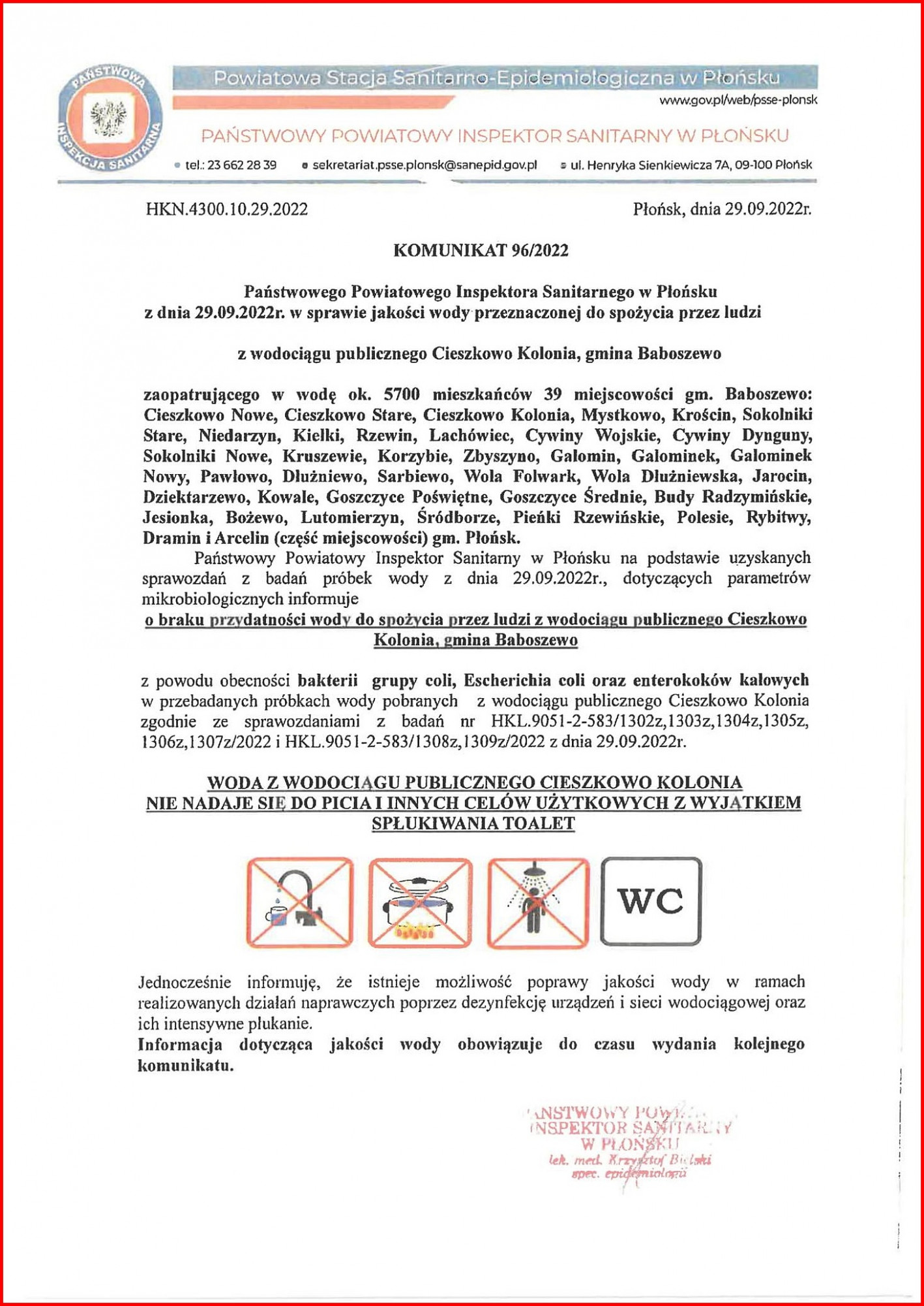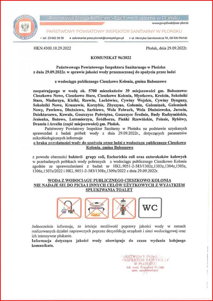 Komunikat 96/2022 PPIS w Płońsku z dnia 29.09.2022r w sprawie jakości wody przeznaczonej do spożycia przez ludzi z wodociągu publicznego Cieszkowo Kolonia gmina Baboszewo.