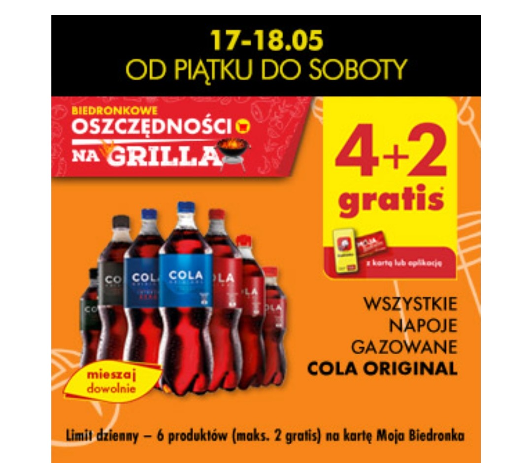 Od piątku, 17 maja, do soboty, 18 maja, klienci sieci supermarketów Biedronka mogą cieszyć się wyjątkową promocją na napoje gazowane Cola Original. Dzięki ofercie „4+2 gratis”, każdy posiadacz karty „Moja Biedronka” może skorzystać z okazji, kupując cztery produkty i otrzymując dwa dodatkowe zupełnie za darmo.