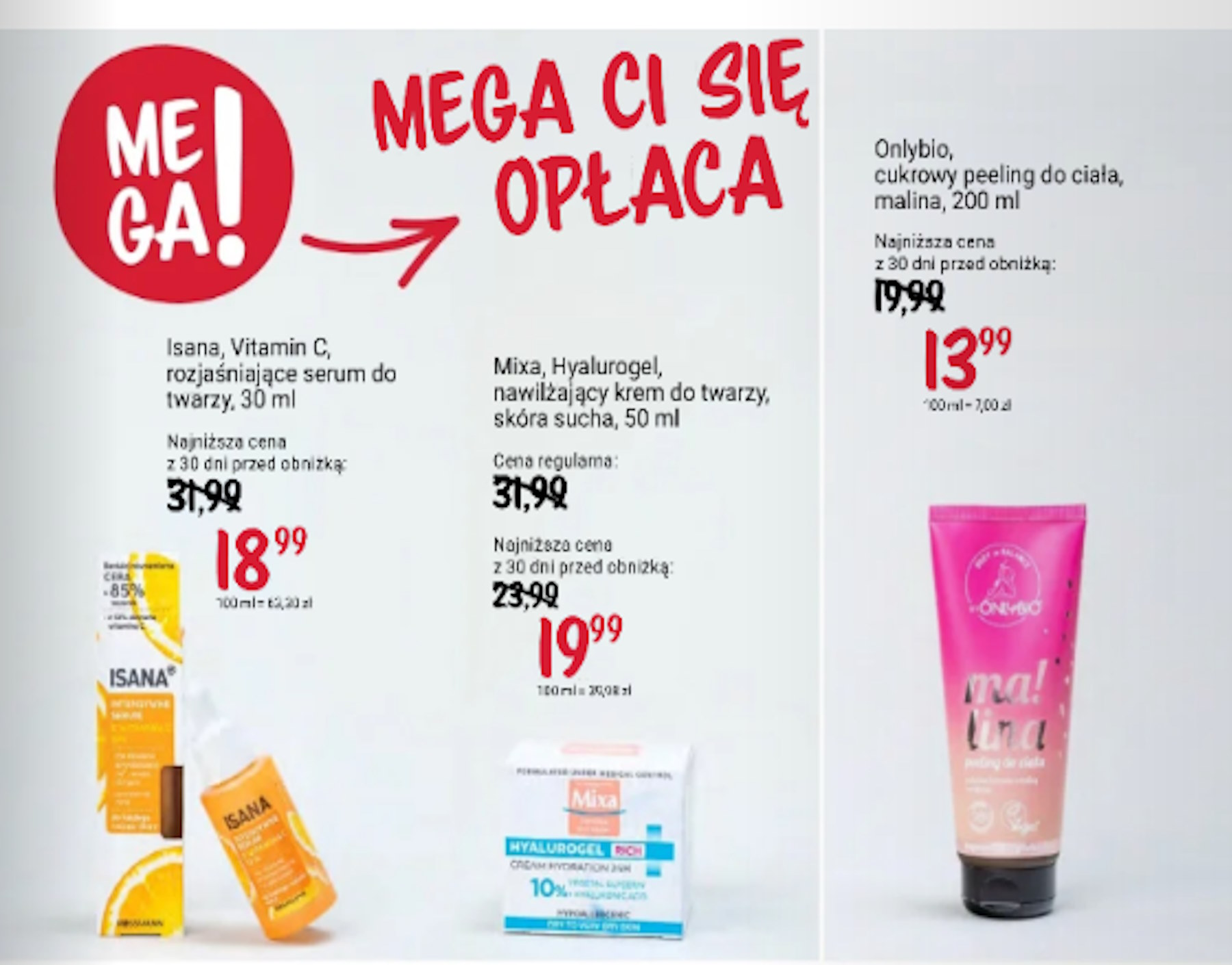 Nie zapomniano także o miłośnikach naturalnych kosmetyków. W megapromocji znajdziemy Onlybio, cukrowy peeling do ciała, malina, 200 ml w cenie 13,99 zł, co jest znaczną obniżką z regularnej ceny 29,99 zł. Peeling ten, oprócz swoich właściwości złuszczających, kusi zapachem malin, a jego naturalny skład zapewnia bezpieczeństwo i komfort użytkowania.
