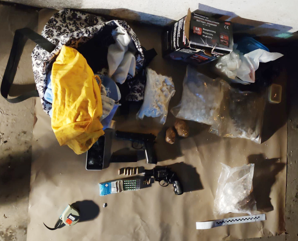 Po wejściu funkcjonariuszy do mieszkania mężczyzna natychmiast został obezwładniony i zatrzymany. Podczas przeszukania funkcjonariusze znaleźli w jego mieszkaniu amfetaminę o wadze blisko 2,5 kilograma oraz substancje psychotropowe w postaci 4-CMC o łącznej wadze prawie 850 gramów. W wyrzuconej torbie zabezpieczono pistolet, rewolwer oraz 64 sztuki amunicji.