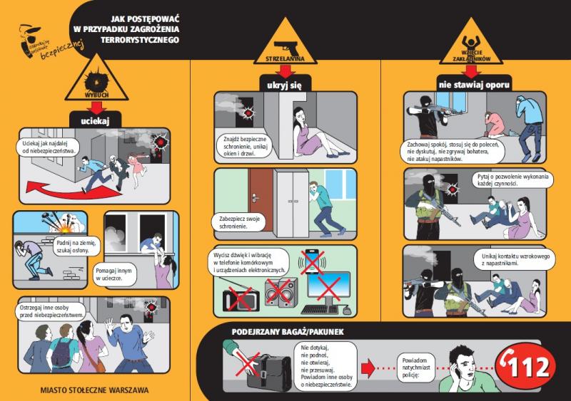 Jak zachowywać się w sytuacji zagrożenia? Co zrobić jeżeli słyszymy wybuch lub strzały? Dowiedzieć się tego można z plakatów, które eksponowane są w pojazdach komunikacji miejskiej i na przystankach.