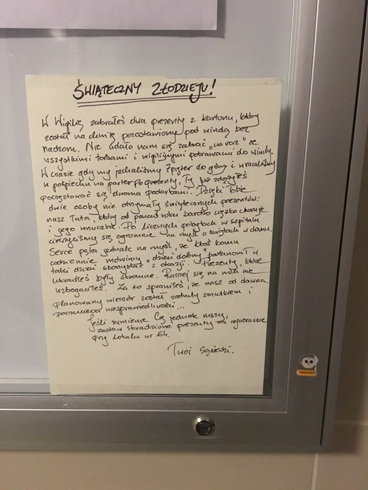 W Wigilię zabrałeś dwa prezenty z kartonu, który został na chwilę pozostawiony pod windą bez nadzoru. Nie udało nam się zabrać „na raz” ze wszystkimi torbami i wszystkimi potrawami do windy. W czasie gdy jechaliśmy 7 pięter do góry i wracaliśmy w pośpiechu na parter o prezenty, to zdążyłeś poczęstować się dwoma podarkami. Dzięki tobie dwie osoby nie otrzymały świątecznych prezentów: nasz tata który od ponad roku bardzo ciężko choruje i jego wnuczka. Po licznych pobytu w szpitalu cieszyliśmy się ogromnie na Myśl o świętach w domu. Serce pęka jednak na myśli, że ktoś komu codziennie mówimy „dzień dobry” postanowił taki dzień skorzystać z okazji. Prezenty które ukradłeś były skromne. Raczej się na nich nie wzbogaciłeś. Za to sprawiłeś, że nasz od dawna planowany wieczór został zatruty smutkiem i poczuciem niesprawiedliwości… Jeśli sumienie cię jednak ruszy, zostaw skradzione prezenty na wycieraczce przy lokalu nr 64.” – brzmi napis na kartce.