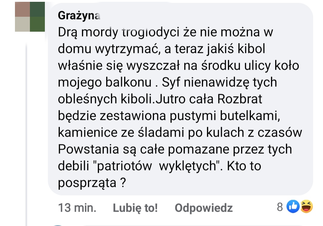 „Drą mordy troglodyci że nie można w domu wytrzymać, a teraz jakiś kibol właśnie się wyszczał na środku ulicy koło mojego balkonu . Syf nienawidzę tych obleśnych kiboli.Jutro cała Rozbrat będzie zestawiona pustymi butelkami, kamienice ze śladami po kulach z czasów Powstania są całe pomazane przez tych debili „patriotów wyklętych”. Kto to posprząta ?” – napisała pani Grażyna pod postem Miasta tołecznego Warszawy o awansie stołecznego klubu.