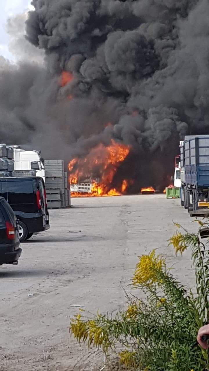 „Płonie hurtownia kwiatów – 2 budynki w tym jeden z olejem napędowym oraz 4 samochody ciężarowe. Zagrożone są pozostałe budynki. W chwili obecnej z ogniem walczy 6 zastępów straży pożarnej.”