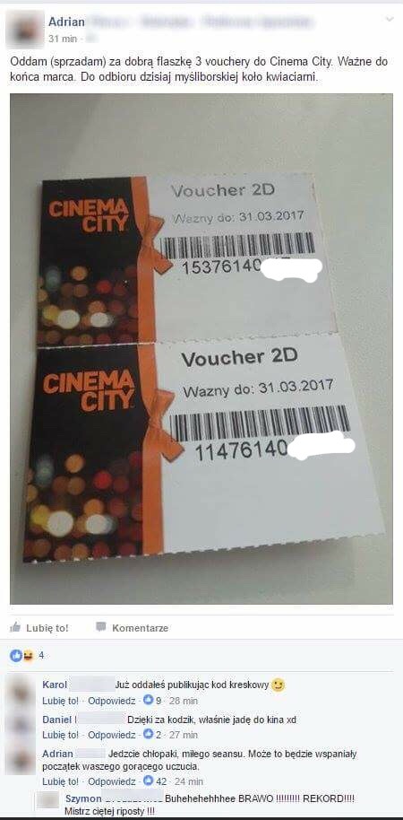 Na jednej z warszawskich grup dyskusyjnych ktoś chciał oddać vouchery do kina. Ponieważ nie zakrył numerów, dwóch użytkowników stwierdziło, że idą do kina. Odpowiedź rozśmieszyła internautów.