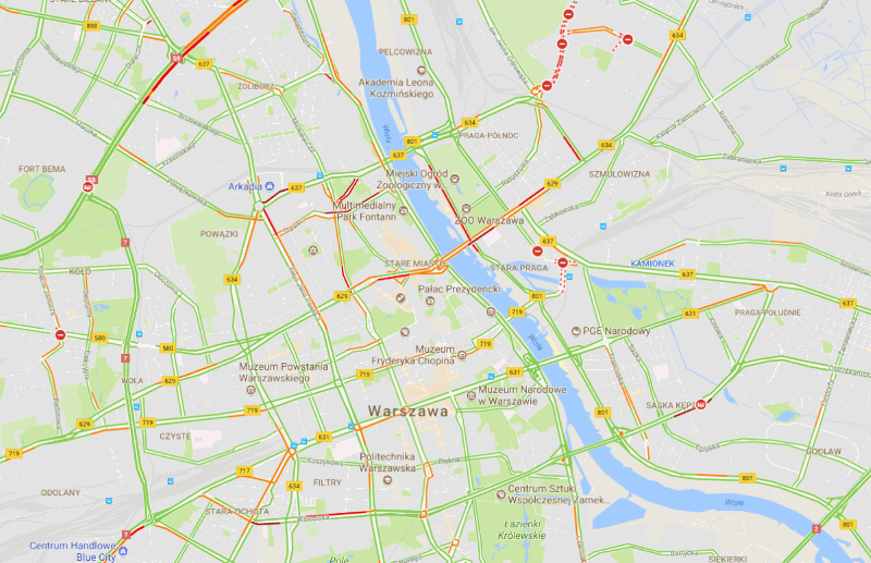 Oprócz poważnych wypadków w Warszawie i okolicach dochodzi do mnóstwa kolizji. Powyższa mapa Map Google pokazuje aktualne utrudnienia w Warszawie. Jest ich bardzo dużo biorąc pod uwagę natężenie ruchu w sobotę.