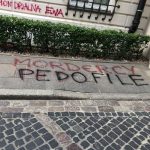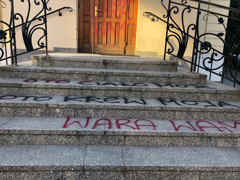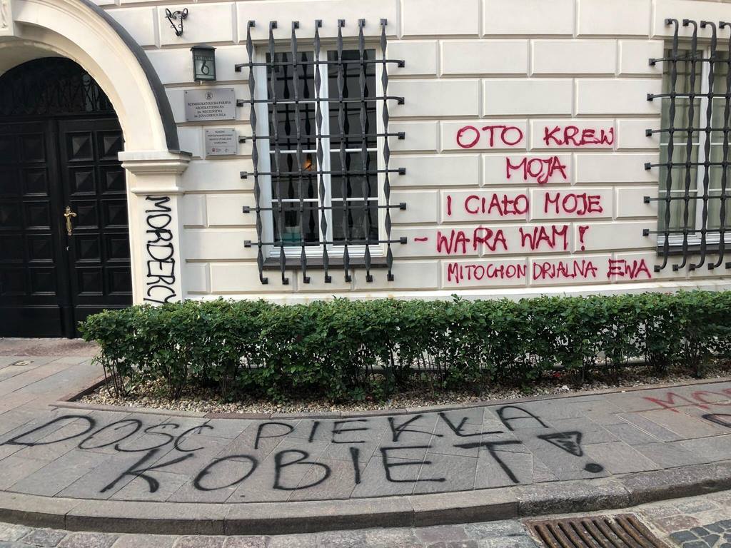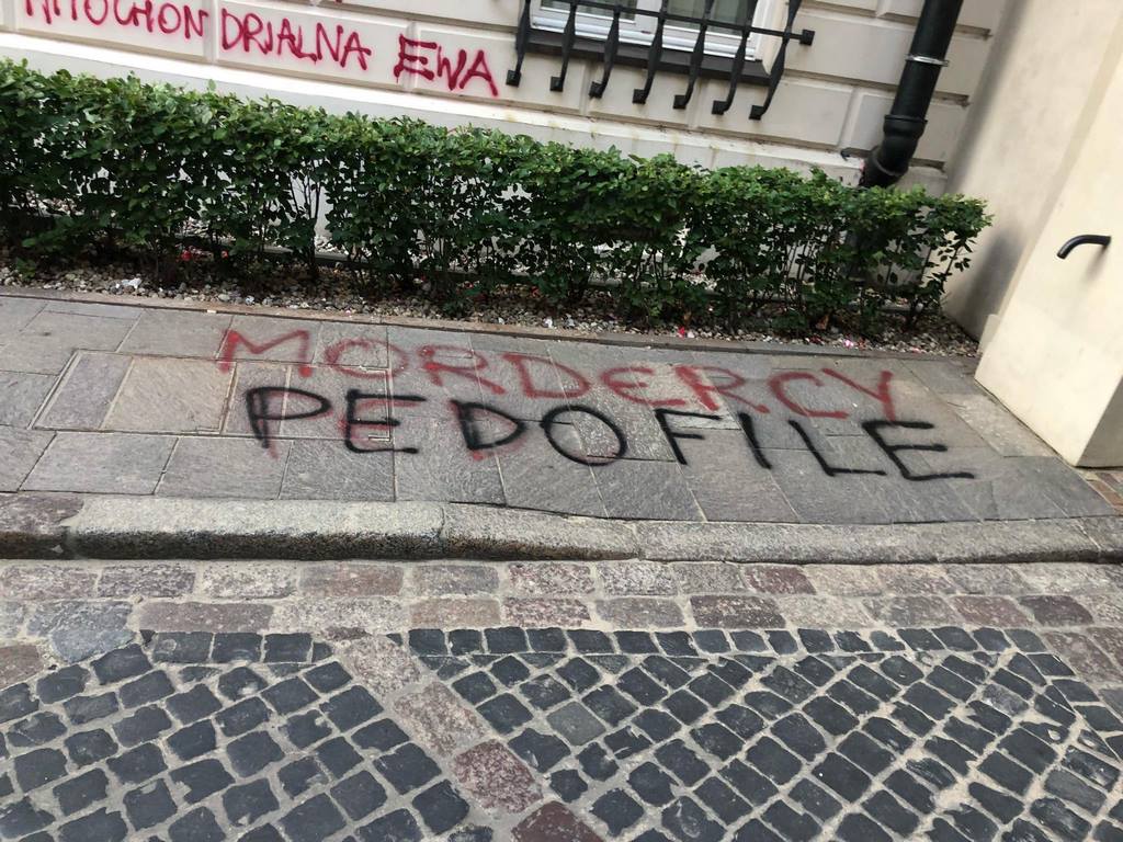 „Mordercy kobiet”. Ktoś pomazał budynek kurii Warszawsko-Praskiej i parafię na Starym Mieście. Turyści robią zdjęcia