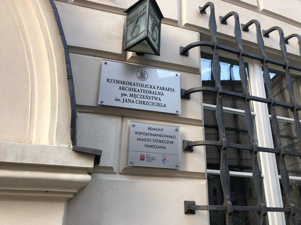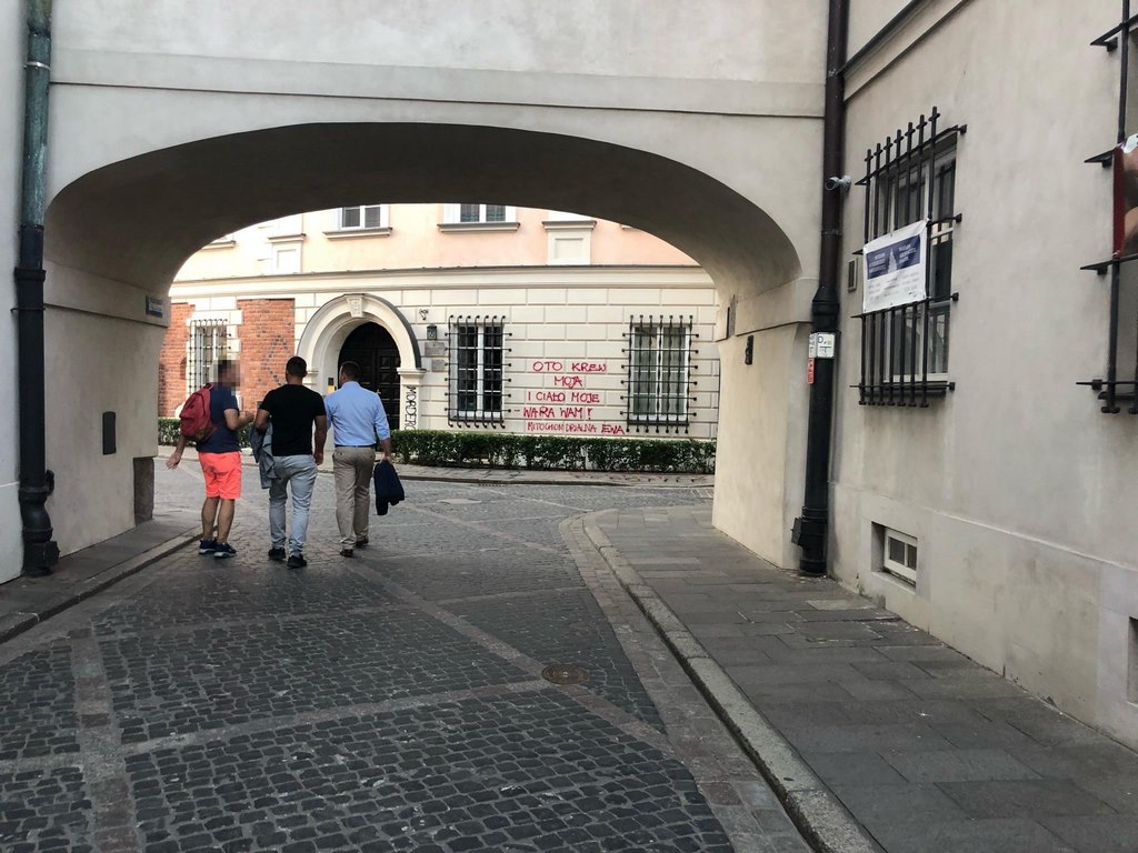 Na budynku Kurii Warszawsko-Praskiej oraz parafii archikatedralnej na Starym Mieście pojawiły się bohomazy m.in. „Mordercy kobiet” i „Rwanda pamiętamy”. Zdumieni turyści robią zdjęcia.