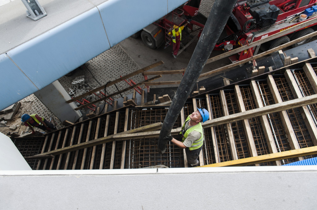 „Powstały już fundamenty schodów, aktualnie budujemy biegi schodów (potocznie: stopnie, po których wchodzimy). Pierwszy z nich został już zabetonowany, w najbliższym czasie ta operacja czeka kolejne schody. Równolegle pracujemy przy budowie zbiorników retencyjnych i kanalizacji odprowadzającej wodę z części kablobetonowej mostu. Cały czas trwają też roboty związane z zabezpieczaniem konstrukcji stalowej i betonowej mostu przed korozją” – informuje ZDM