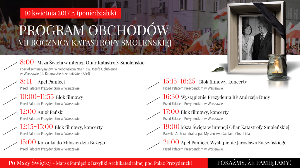 Prawi i Sprawiedliwość opublikowało szczegółowy plan obchodów 7 rocznicy Katastrofy prezydenckie TU-156 pod Smoleńskiem. Będzie msza, modlitwy, blok filmowy i wystąpienia najważniejszych osób w państwie.