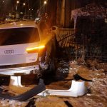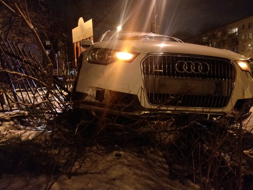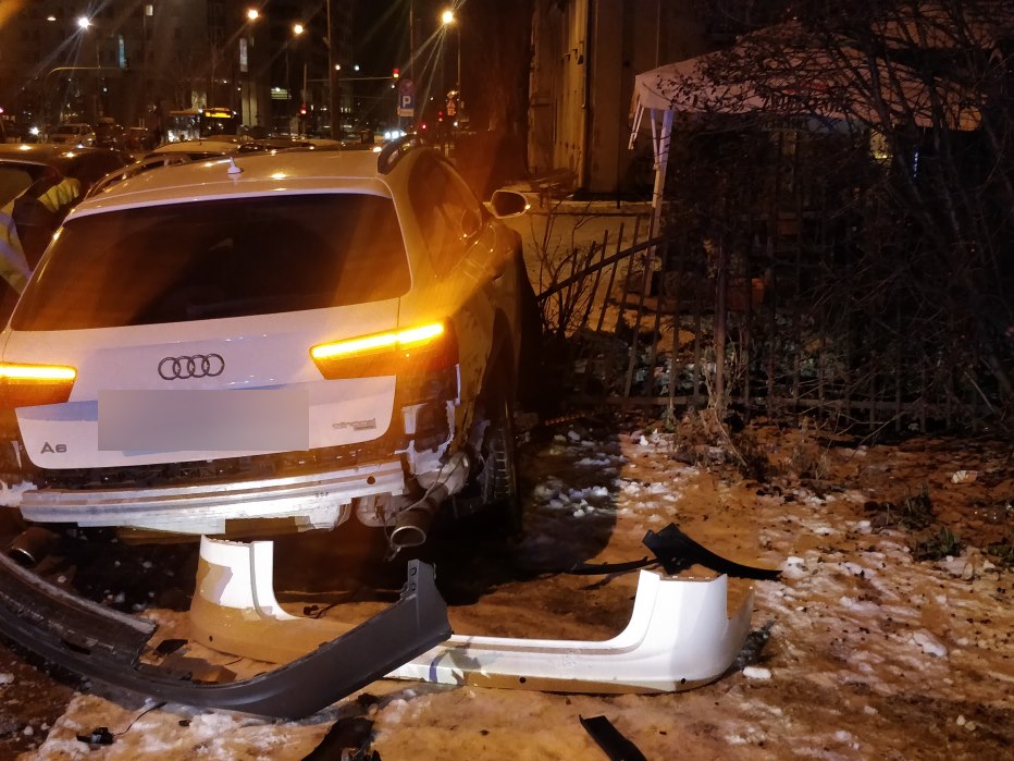 Na ulicy Bonifraterskiej na warszawskim Muranowie doszło do nietypowej kolizji. Kierowca audi wjechał w stojak na rowery, skosił słupek i zawisł na ogrodzeniu.