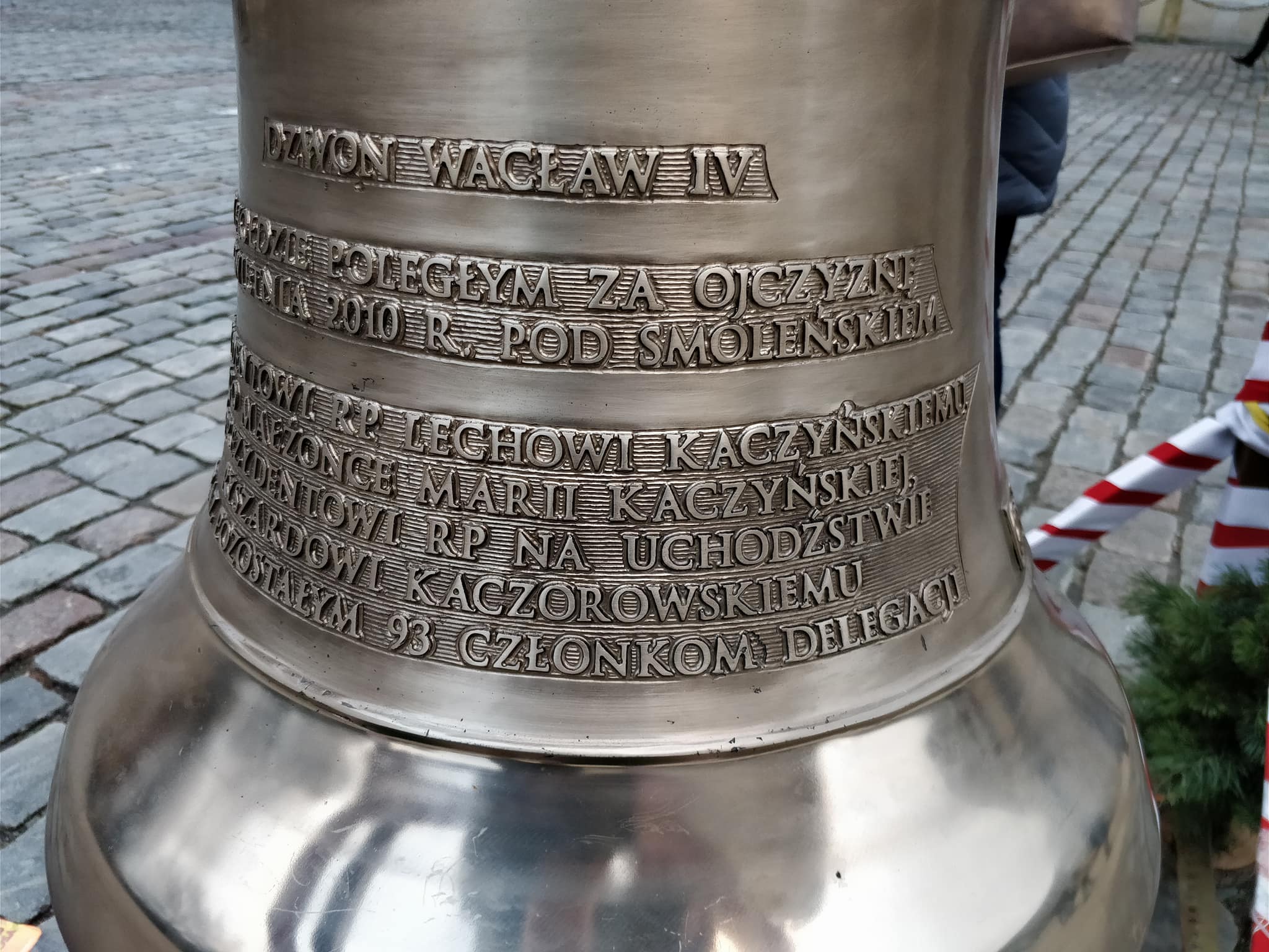 Dzwon został poświęcony pamięci ofiar katastrofy smoleńskiej, na co jasno wskazuje inskrypcja z drugiej strony.