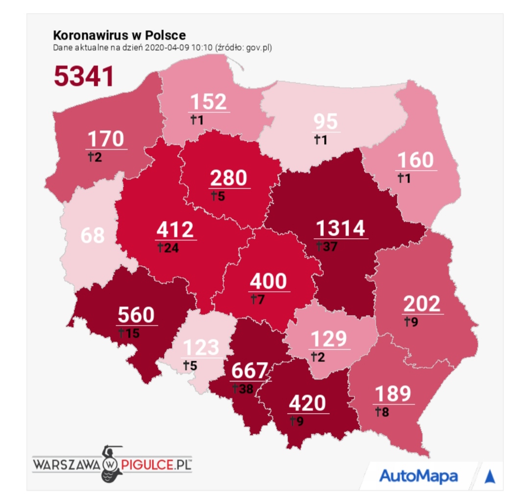 Na Mazowszu zarażonych 1314 osób. 37 osób zmarło [MAPA]
