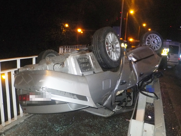 Strażnicy miejscy, którzy w sobotę ok. 23.00 jechali w kierunku centrum przy zjeździe z mostu Gdańskiego zauważyli rozbite bariery ochronne i przewrócone na dach auto. Funkcjonariusze zabezpieczyli miejsce wypadku. Obok pojazdu znajdowali się dwaj mężczyźni – kierowca i pasażer. Strażnicy miejscy wezwali pogotowie ratunkowe i policję. Obaj mężczyźni zostali karetkami zabrani do szpitali.