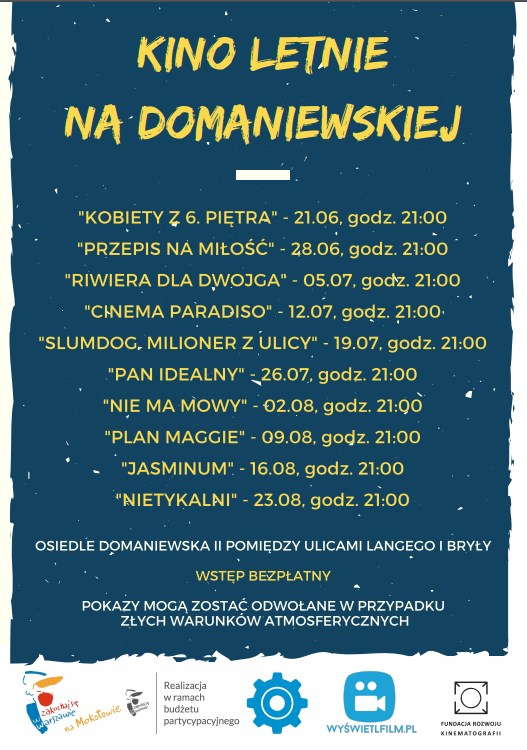 21 czerwca 2017 r. rusza przegląd filmów w ramach Kina Letniego na Domaniewskiej. Wydarzenie zostało zrealizowane w ramach budżetu partycypacyjnego ze środków Urzędu Dzielnicy Mokotów. Partnerem projektu jest Fundacja Rozwoju Kinematografii.