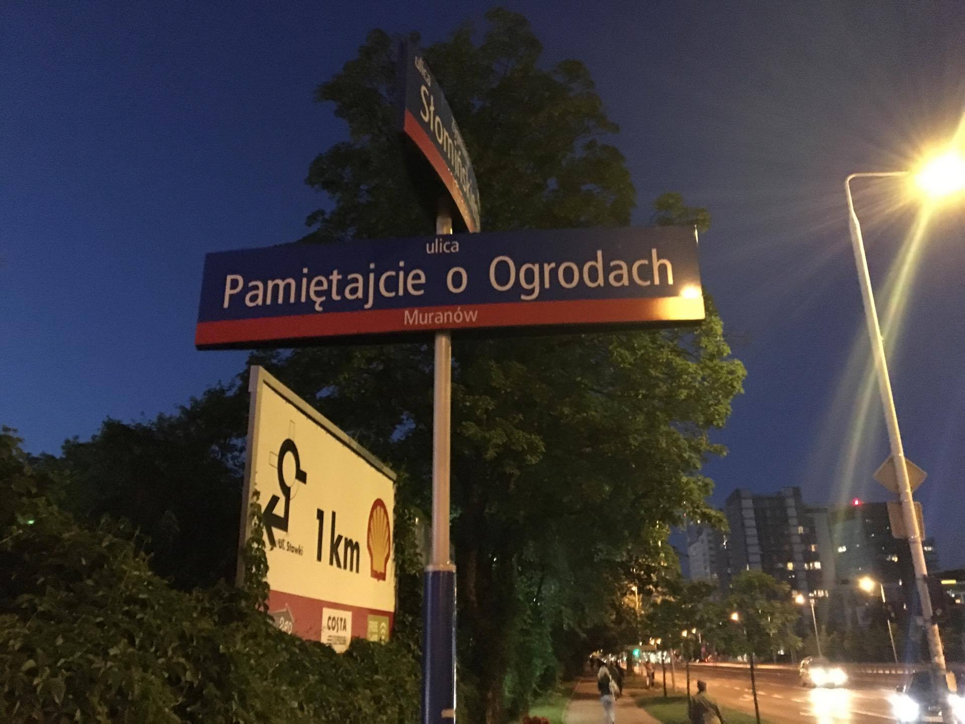 „Ulica Pamiętajcie o Ogrodach znajduje się na Muranowie w Śródmieściu, przebiega równolegle do zachodniej ściany CH Arkadia. Odchodzi w kierunku północnym od ul. Słomińskiego i kończy się rondem przy ul. Kłopot.