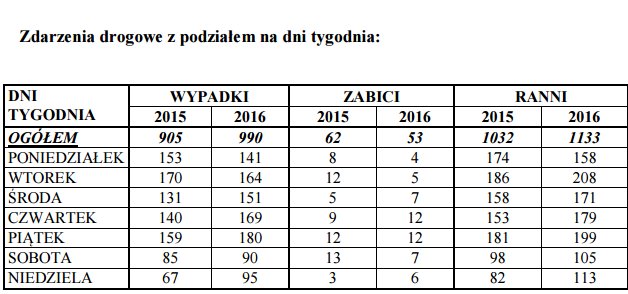 W grudniu 2016 roku na terenie miasta stołecznego Warszawy odnotowano: 142 wypadki drogowe (o 39 więcej niż w grudniu 2015 r.), w wyniku których 6 osób poniosło śmierć (mniej o 8), a 164 osoby doznały obrażenia ciała (więcej o 54) oraz 2489 kolizji drogowych (o 118 więcej). Analizując zdarzenia drogowe z podziałem na dni tygodnia stwierdzić należy, iż najwięcej wypadków drogowych miało miejsce w piątki (180). Najwięcej ofiar śmiertelnych odnotowano w czwartki i piątki (po 12).