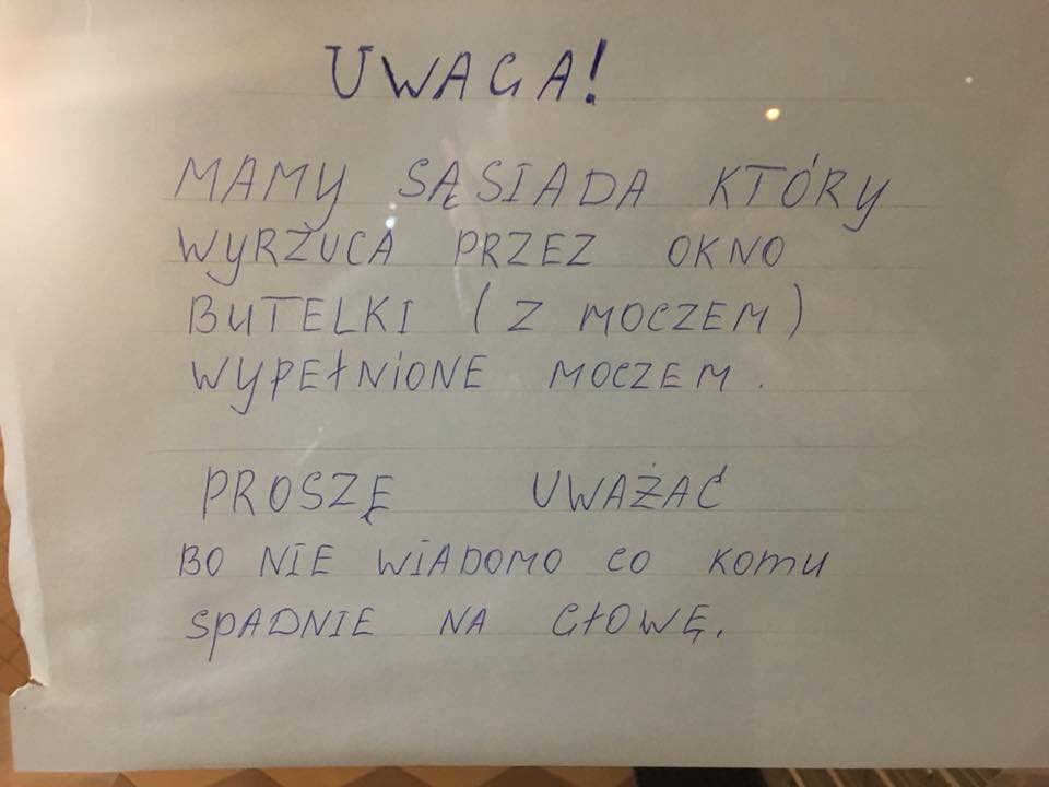 Kartka pochodzi z drzwi jednego z bloków na Zielonym Zaciszu. O zawartości butelki przekonała się jedna z kobiet, gdy ta z rzeczoną zawartością uderzyła o balkon i się rozbiła.