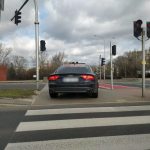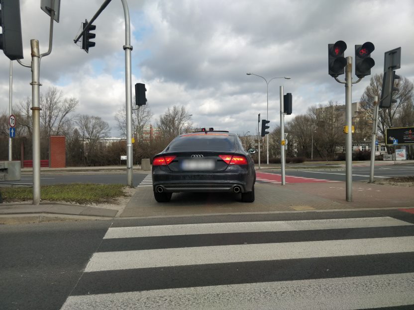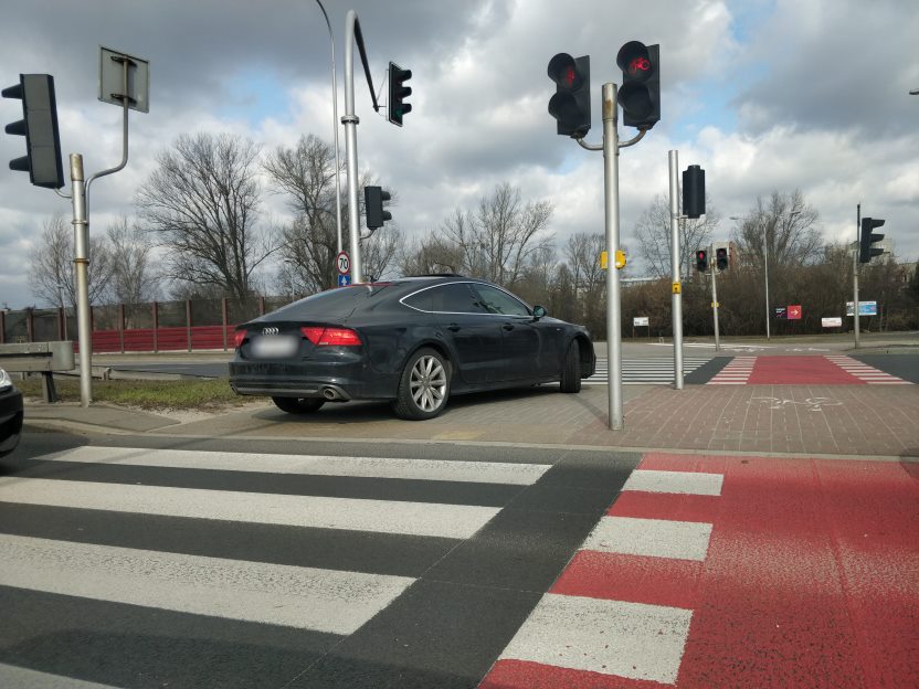 Kierowca nie chcąc stać jak inni w korku postanowił zawrócić w miejscu niedozwolonym – na przejściu dla pieszych.