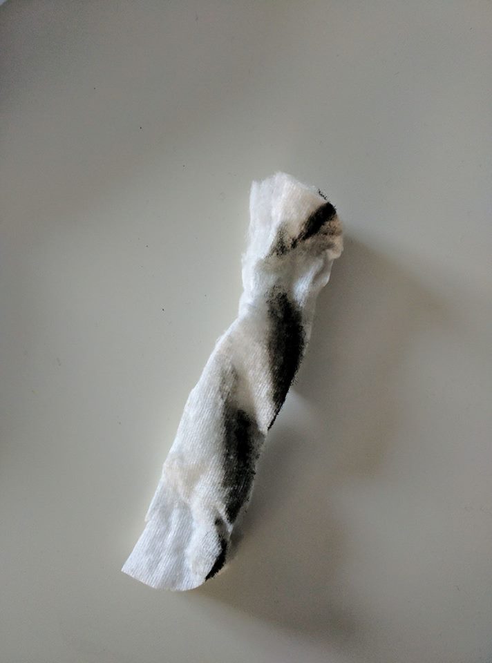 „Mój amatorski filtr założony na wywietrznik okienny (przymknięty do minimum)” – napisała Pani Joanna. Filtr wykonała z… dużego wacika do pielęgnacji niemowląt. Taki pakunek tkwił w oknie od Trzech Króli , czyli od 6 stycznia. Daje to 22 dni, czyli troszkę ponad trzy tygodnie. Widok nie napawa optymizmem…