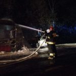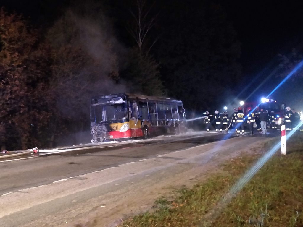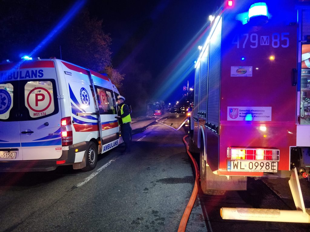 Na ulicy Pogonowskiego w Nieporęcie w tył autobusu miejskiego uderzył samochód osobowy. Autobus stanął w płomieniach.